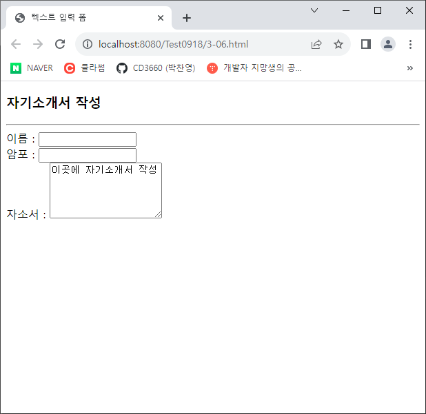 자소서 : <textarea rows="5" cols="20">이곳에 자기소개서 작성</textarea>