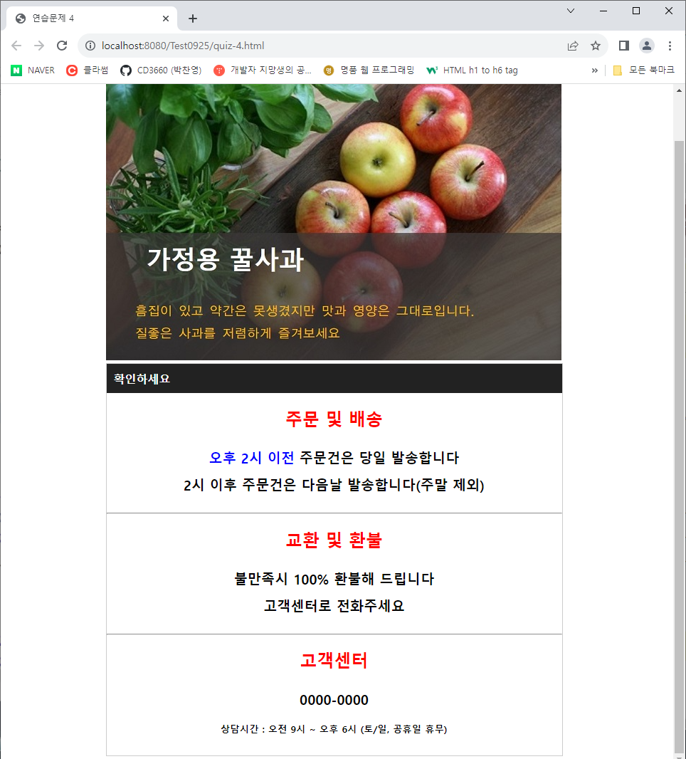 - h2 제목 스타일은 글자 색 #ff0000, 글자 크기 1.5em, 가운데 정렬로 합니다.