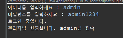 - -------------------출력결과(console)-------------------- 아이디를 입력하세요 : admin 비밀번호를 입력하세요 : admin1234 로그인 중입니다. 관리자님 환영합니다. admin님 접속